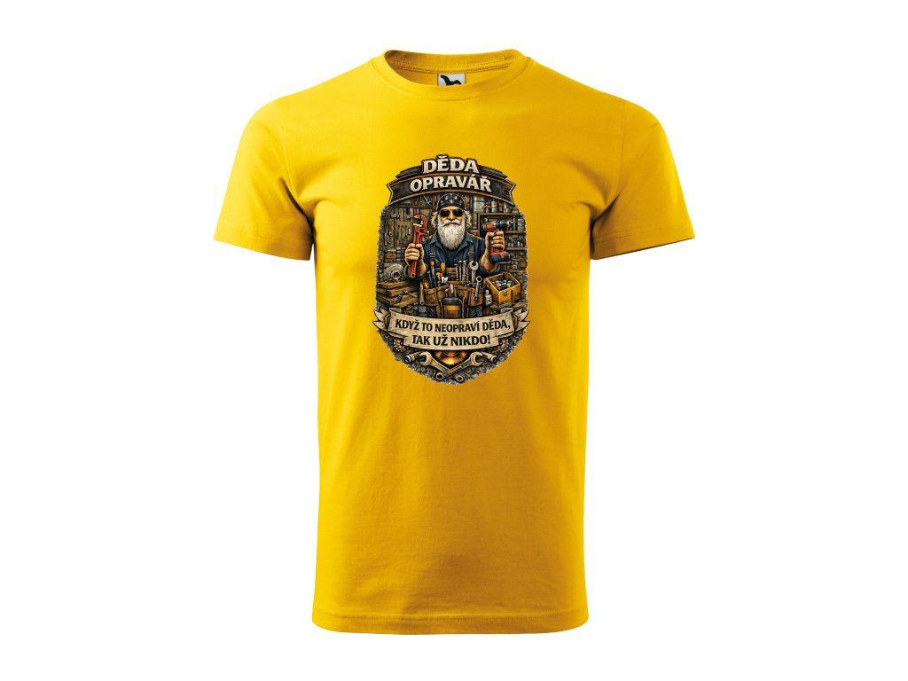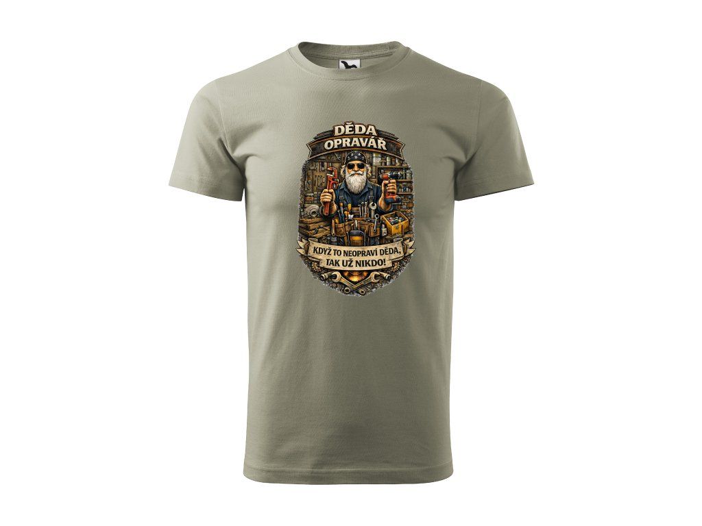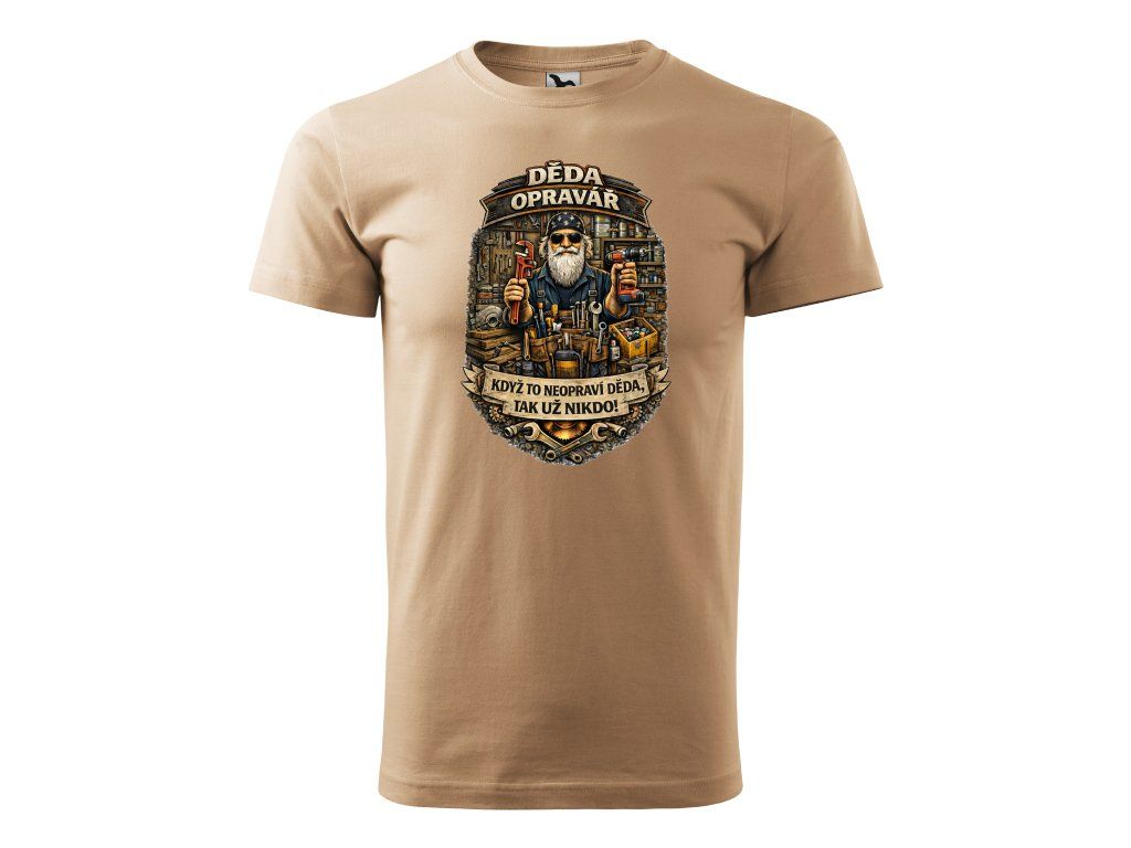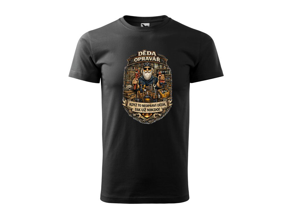 Detailní motiv s nářadím a dílnou dodává tričku charakter a styl, který ocení každý praktický muž. Výrazný nápis „Když to neopraví děda, tak už nikdo!“ přesně vystihuje jeho zkušenosti a respekt.